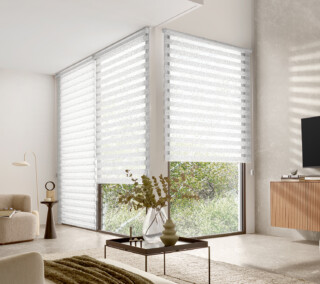 Naš Twinrollo ima mnogo faseta: Kombinira prednosti roloa i žaluzine. Naizmjenično neprozirno i transparentno tkani materijali omogućuju kontinuiranu regulaciju svjetlosti s ugodnim, blagim svjetlom u prostoriji.